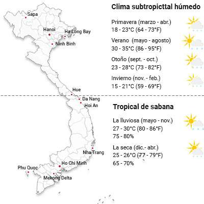 El clima de Vietnam es diverso, con un clima subtropical húmedo en el norte y tropical de sabana en el sur. Esta división climática se debe al terreno alargado del país, dividido por la montaña Bach Ma. Desde el paso de Hai Van hacia el norte, el clima se divide en 4 estaciones distintas, primavera, verano, otoño e invierno. Mientras tanto, el clima del sur de Vietnam, desde el paso de Hai Van hacia el sur, se divide en dos estaciones principales, la seca y la lluviosa.