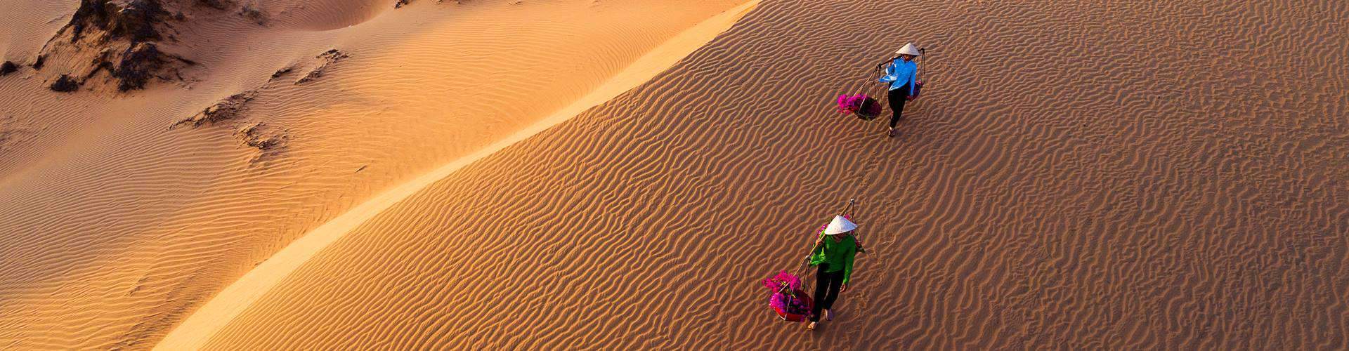 Localizada na cidade de Phan Thiet, Mui Ne é uma cidade costeira de pescadores no sul do Vietnã, o refúgio perfeito da cidade de Ho Chi Minh. Popular pelos inúmeros campos de windsurf da região, visite Mui Ne entre outubro e abril para experimentar este esporte de aventura. Outras atividades interessantes incluem surfar nas gigantescas dunas de areia vermelha fora da cidade com sandboards e ATVs ou fazer uma caminhada suave de meio dia pelo encantador Fairy Stream Canyon. Red Sand Dunes: Surfe nas gigantescas dunas cor de açafrão de sandboard ou jipe enquanto espera para capturar o pôr do sol de tirar o fôlego. Fluxo de fadas: Dê um passeio suave descalço pelas paredes avermelhadas do desfiladeiro de um calmo leito de riacho. Mercado da Aldeia de Pescadores de Mui Ne: É a vida de um pescador aqui, onde barcos coloridos com a pesca do dia adornam um extenso litoral. Ilha Hon Rom: Experimente kite ou windsurf aqui de outubro a março.