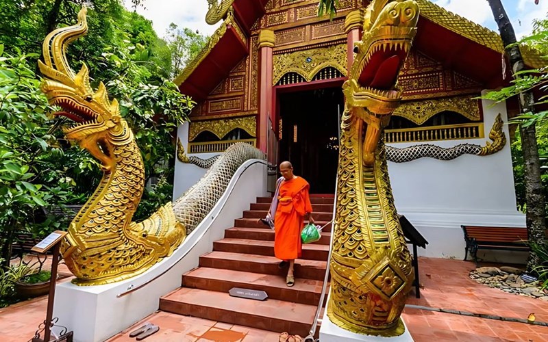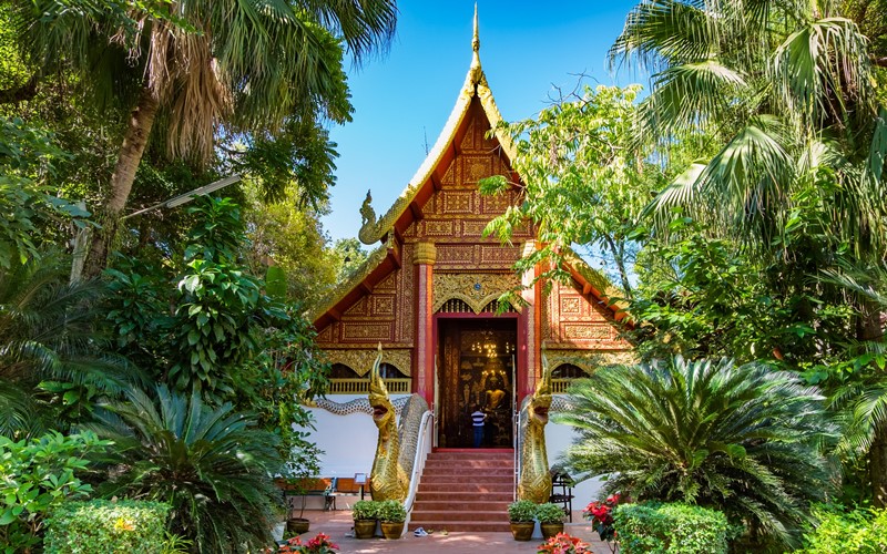 - Wat Phra Singh (a 350m): Um dos templos mais antigos da cidade, com arquitetura Lanna e lar histórico da sagrada imagem de Buda Phra Singh.