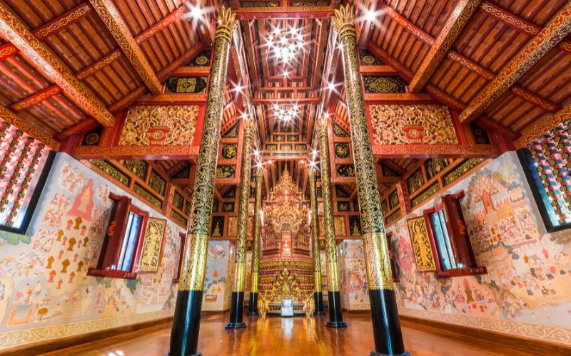 Dentro do viharn, os visitantes encontrarão uma réplica dourada da reverenciada estátua do Buda Phra Singh. Ela está posicionada no centro do salão, em postura meditativa. A expressão serena da estátua e o olhar suave criam uma atmosfera pacífica e espiritual para aqueles que vêm prestar respeito.