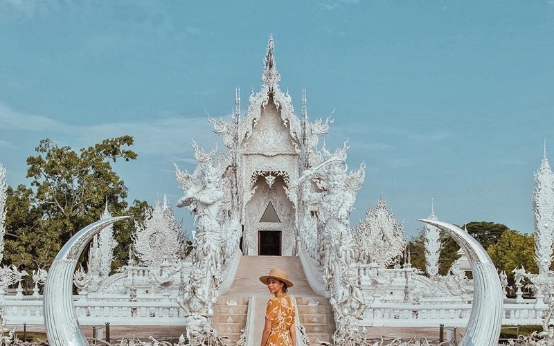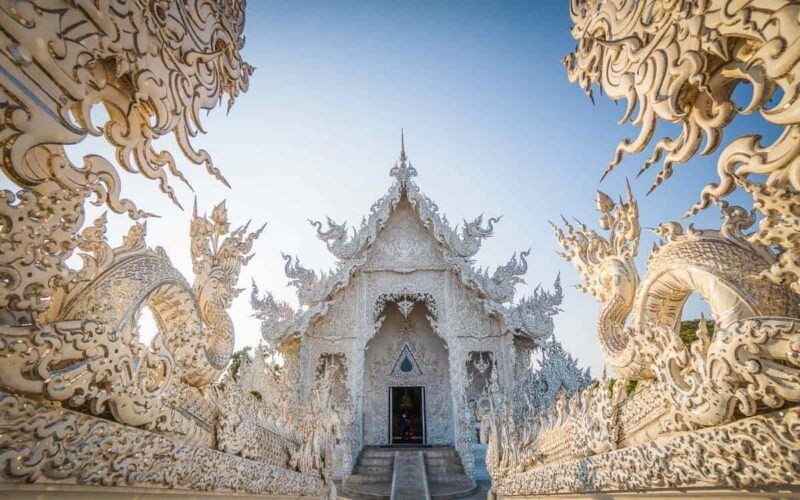 Diferente dos tradicionais templos dourados da Tailândia, Wat Rong Khun é inteiramente branco, simbolizando a pureza de Buda. Essa escolha única de cor o diferencia, criando uma presença surreal e quase mística.