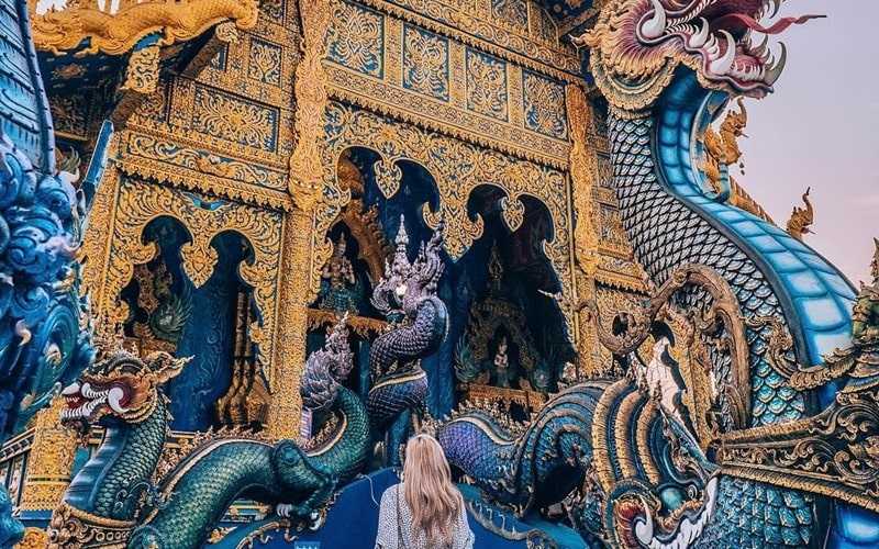 O Templo Azul Tailandês combina inovação e criatividade na arte budista contemporânea, misturando elementos tradicionais tailandeses com um impressionante esquema de cores azuis e detalhes dourados intricados.