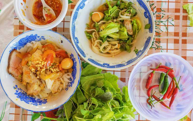 Banh canh: a farinha de arroz é grelhada em tigelinhas no fogareiro a carvão, e depois é coberta com cebolinhas e ovos. Banh Canh também leva camarão e lulas frescas.