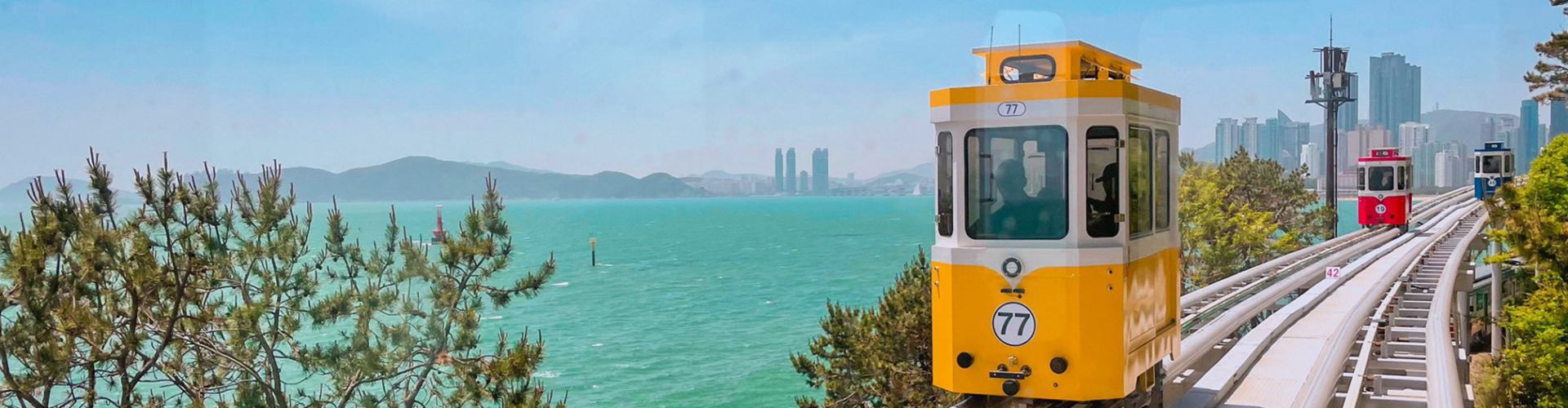 Un colorido tren turístico que recorre lentamente la costa de Busan. Perfecto para relajarse y admirar el paisaje camino a la playa más famosa del país.